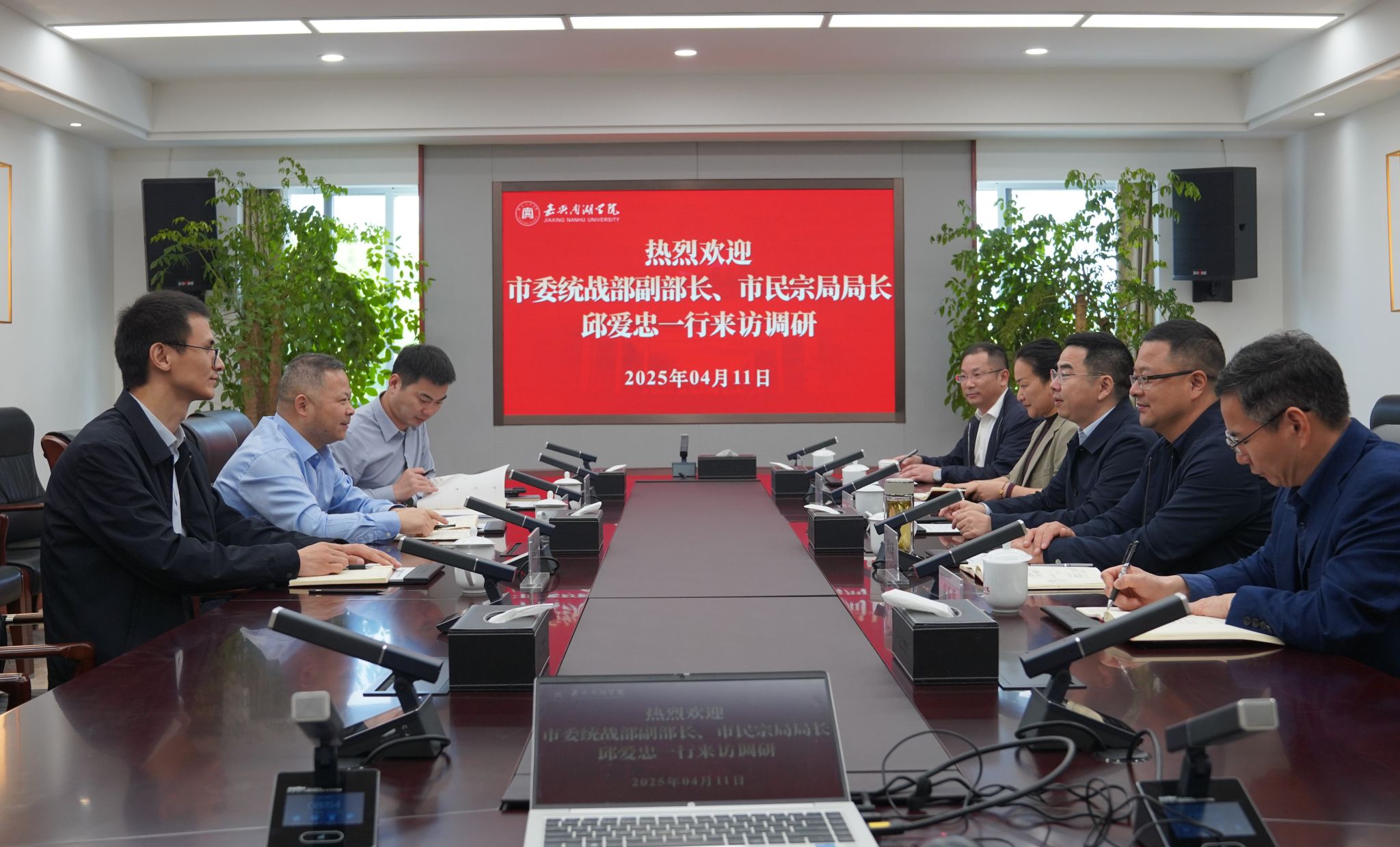 4月11日上午,嘉兴市委统战部副部长、市民宗局局长邱爱忠一行来访交流,校党委书记倪沪平接待邱爱忠一行,校领导胡文蔚、蒋娟芬、庄应强参加座谈。